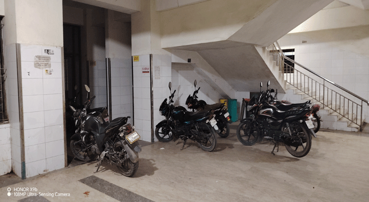 হাসপাতাল ভবনের ভিতরে পার্কিং করা সাথে সারি সারি মোটসাইকেল