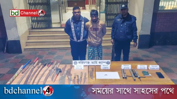 পাকুন্দিয়ায় মাদকদ্রব্য ও বিপুল পরিমাণ দেশীয় অস্ত্রসহ দুইজন গ্রেফতার