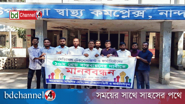নান্দাইলে মেডিকেল টেকনোলজিস্ট ও ফার্মাসিস্টদের ১০ম গ্রেড বাস্তবায়নের দাবিতে মানববন্ধন