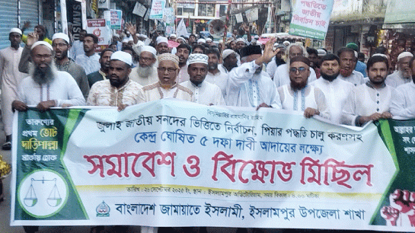 ইসলামপুরে জুলাই সনদ ও পিআর পদ্ধতিতে নির্বাচনের দাবিতে জামায়াতের বিক্ষোভ মিছিল