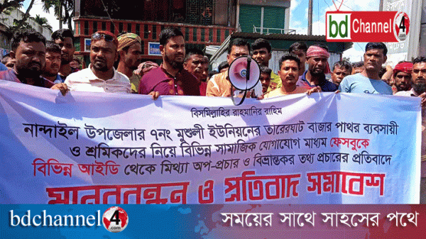 নান্দাইলে পাথর ব্যবসায়ী ও শ্রমিকদের বিরুদ্ধে অপপ্রচারের প্রতিবাদে মানববন্ধন